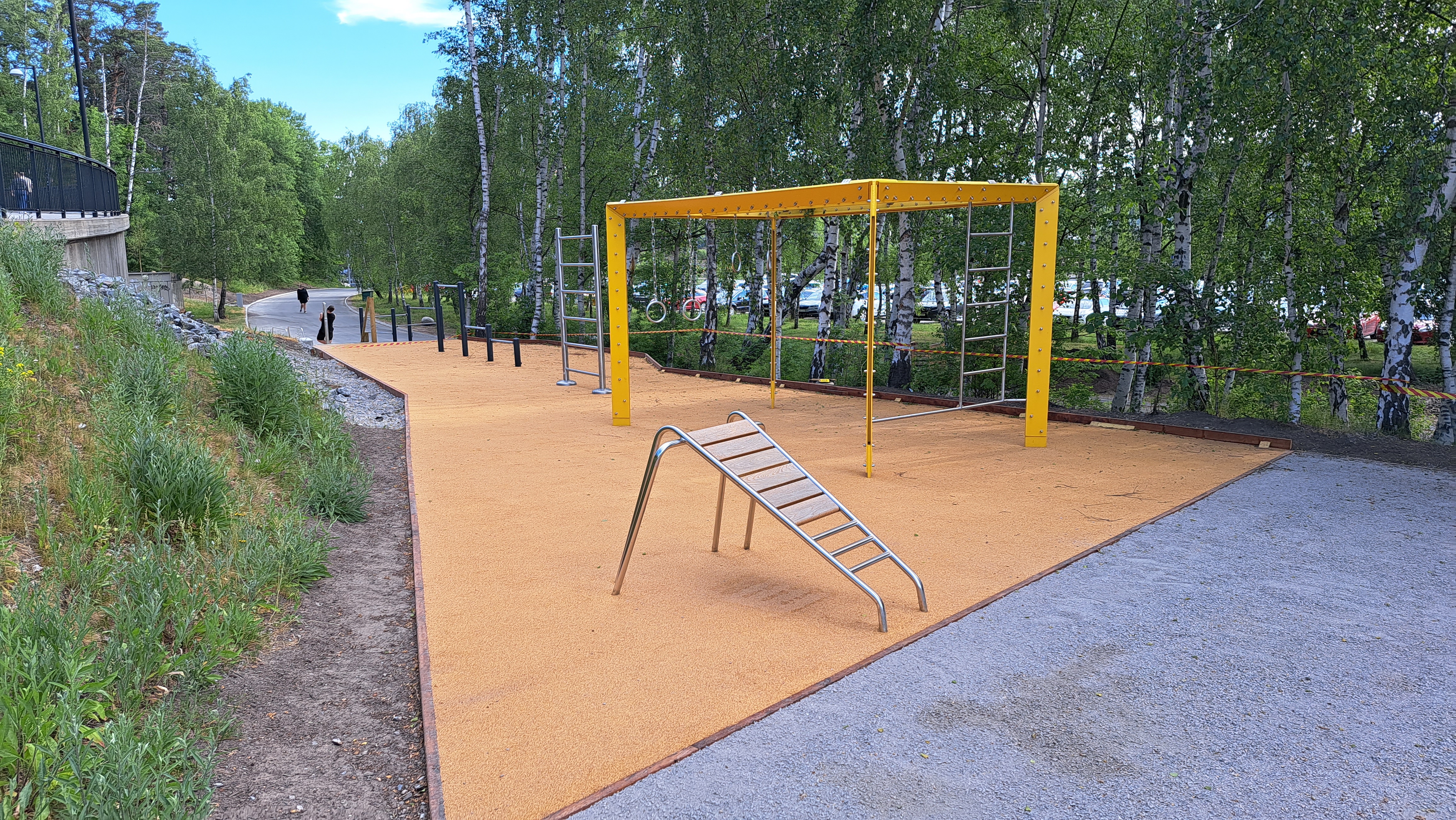 Vårt fina utegym ligger till vänster om huvudentrén, alledeles intill parkeringen. Markbeläggningen är belagd med kork i enda delen och träflis i den andra. Här finns en rad redskap för olika typer av träning. Varje redskap har dessutom grepp i olika dimensioner för att passa både små och stora händer.